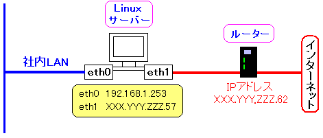おっとっと。NATについて、触れていなかったので、書くことにします。 社内(プライベートアドレス)から社外(グローバルアドレス)へ飛ぶ際、 IP変換を行なうために、NATが必要になる。 本に、ipchainsの設定方法があったので、やってみる事にした。 ハッキリ覚えていない。なぜなら、適当に触っている間に、設定が うまくいったからだった。 単に、FORWARDだけの話なら、丸写し個所がわかるのだが、 ちょっとしたファイヤウォールの設定まであり、ゴチャゴチャしていたため、 何もわかっていなかった私は、混乱していた。 試行錯誤の上、社内(プライベートアドレス)から社外(グローバルアドレス)へ pingが飛ぶようになったのを確認して「設定成功!」と喜んだりしたが、 何せ、メモも何もないので、再起動をすると、ipchainsの設定はやり直し。 また、適当に触って、運良く設定がうまくいくのを祈るのを繰り返していた (^^;; しかし、ipchainsの設定がうまくいかなくても、あまり支障はなかった。 メール・プロキシー・DNSサーバーがNATでもあるため、 わざわざIPアドレスの変換してパケット転送しなくても、 プライベート側からサーバーにアクセスして、メールを読んだり、 DNS検索したり、プロキシーにアクセスして、プロキシーが外へ見に行く時は、 グローバル側から出るという形になっていた。
