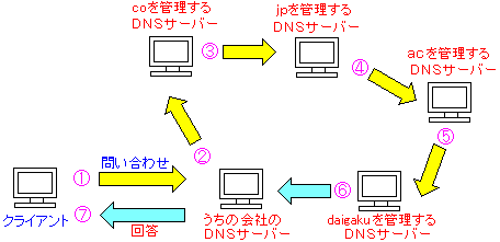 | (6) | coを管理しているDNSサーバーに問い合わせる。 |